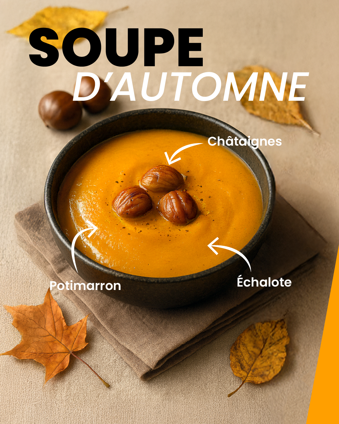 L’association du potimarron fondant et de la châtaigne légèrement sucrée, offre une texture onctueuse, un goût authentique et une douce sensation de cocooning.